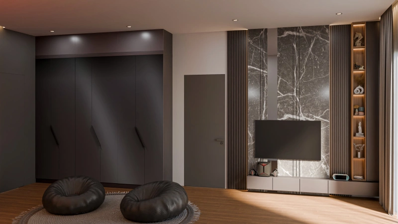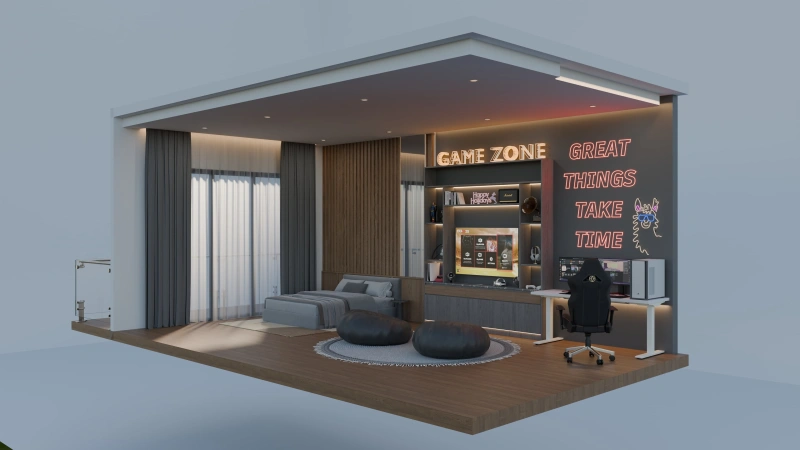 This 3D-rendered modern gamer bedroom blends comfort and creativity with a sleek marble TV wall, integrated storage, and a vibrant “Game Zone” setup featuring dual monitors, RGB lighting, and a neon sign. A cozy bed and stylish partition complete the design, perfect for showcasing in portfolios or interior projects.