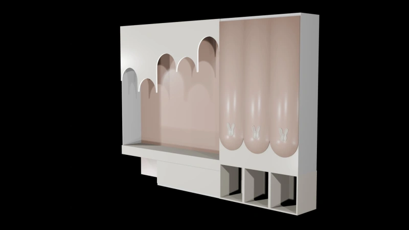 The arched pattern above the desk refers to a dreamy cloud or dripping ice, adding a fairytale touch to the space. Bunny-shaped handles on the wardrobe doors add a lovable detail that kids will adore.