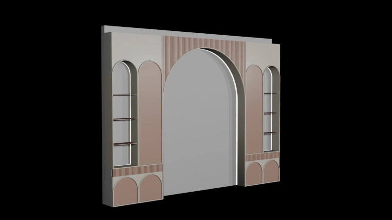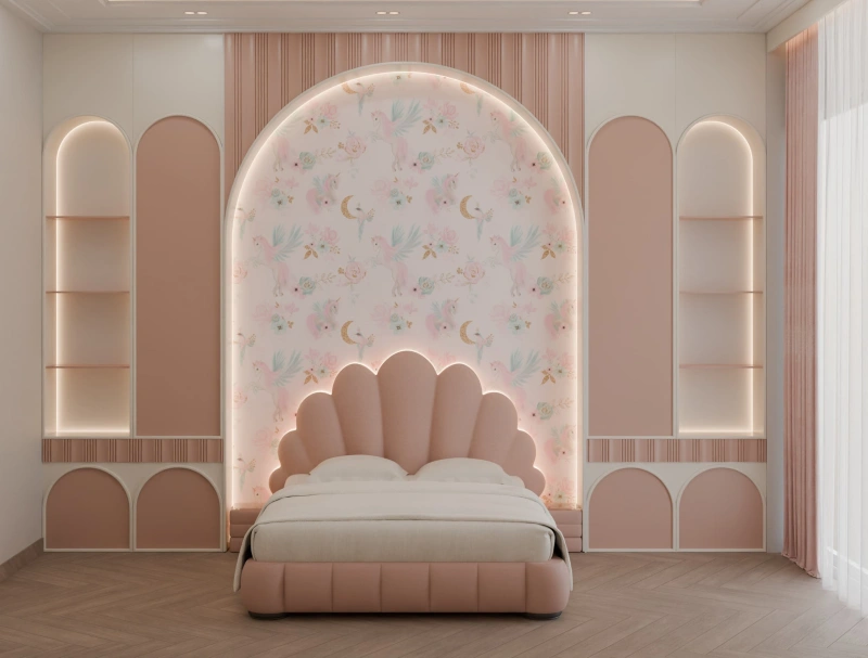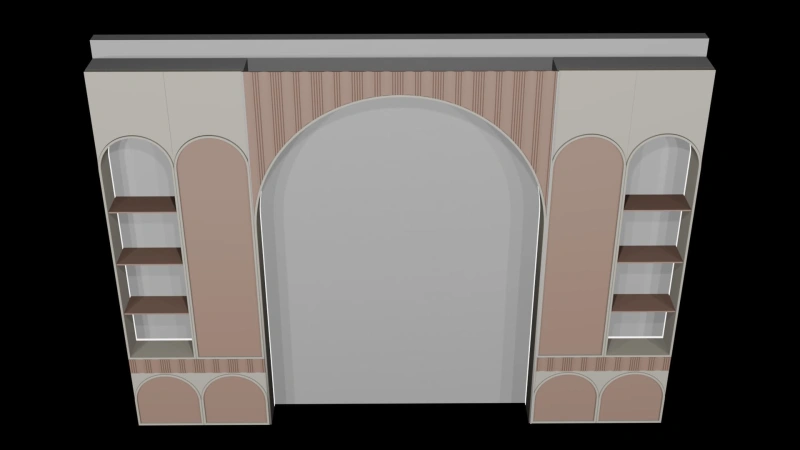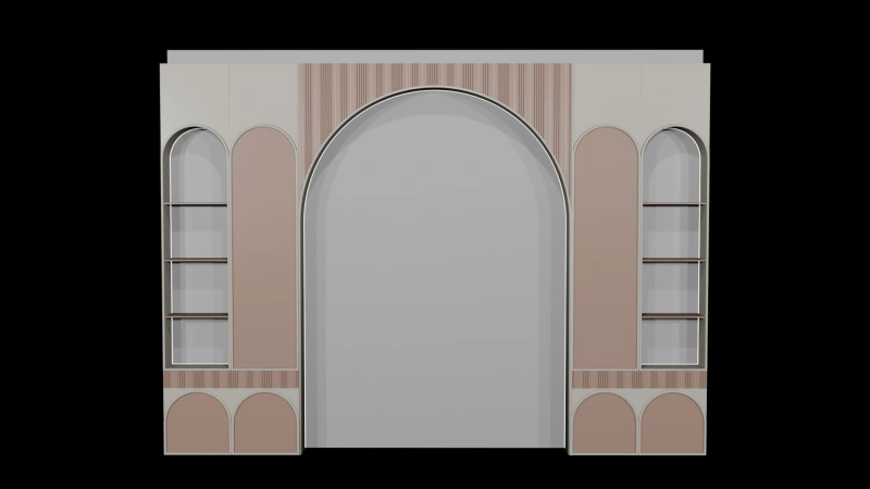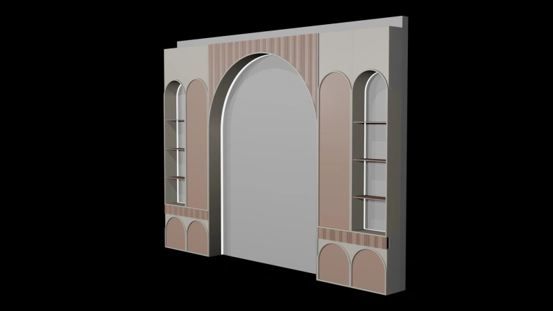 Enhance your interiors with this elegant 3D bed wall panel, featuring a stylish arched design, built-in storage shelves, and soft LED strip lighting. The dual-tone blush and beige finish adds a modern touch, while the ambient lighting highlights the structure beautifully—day or night. Perfect for luxury bedroom renders and interior design projects.